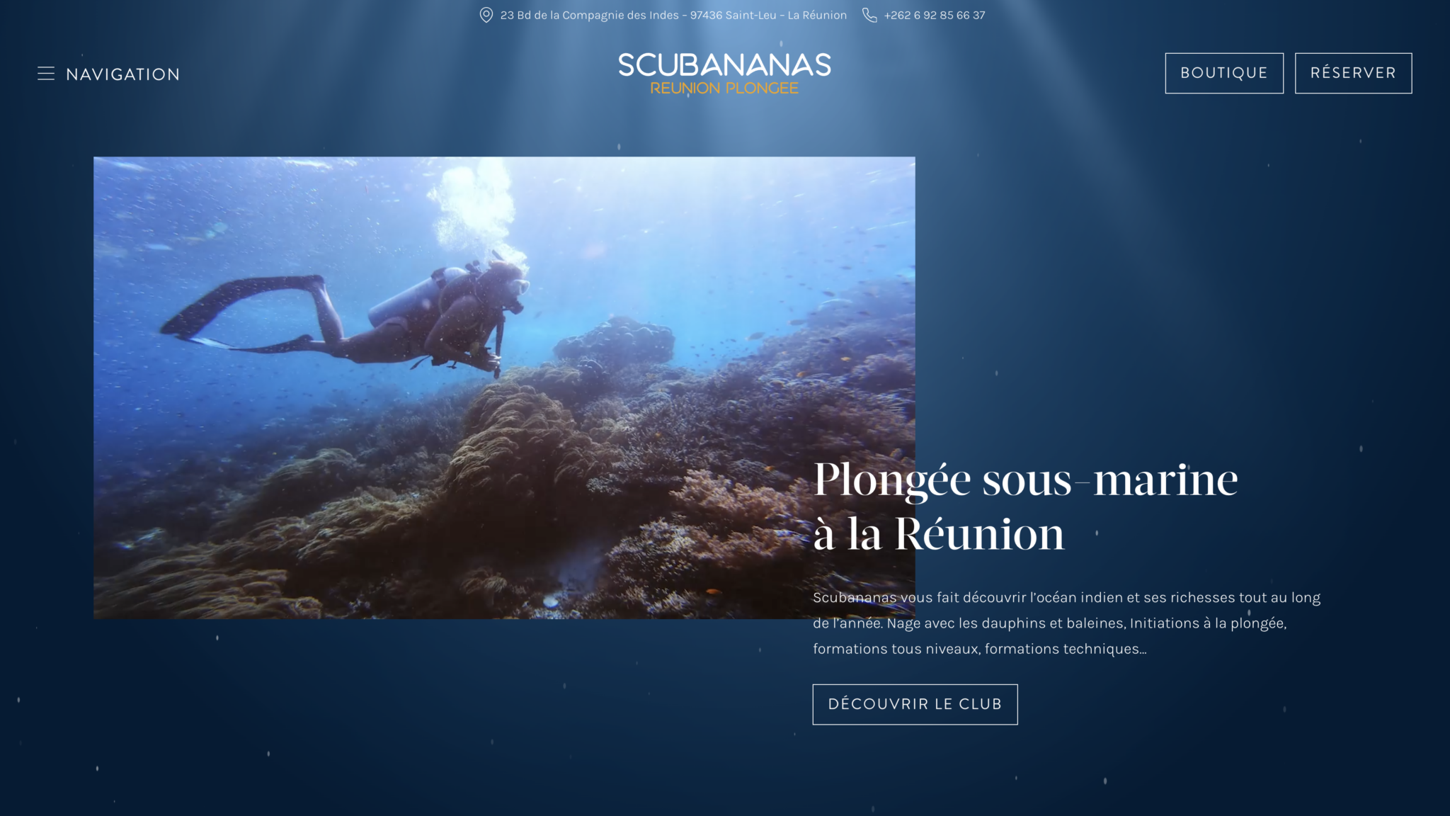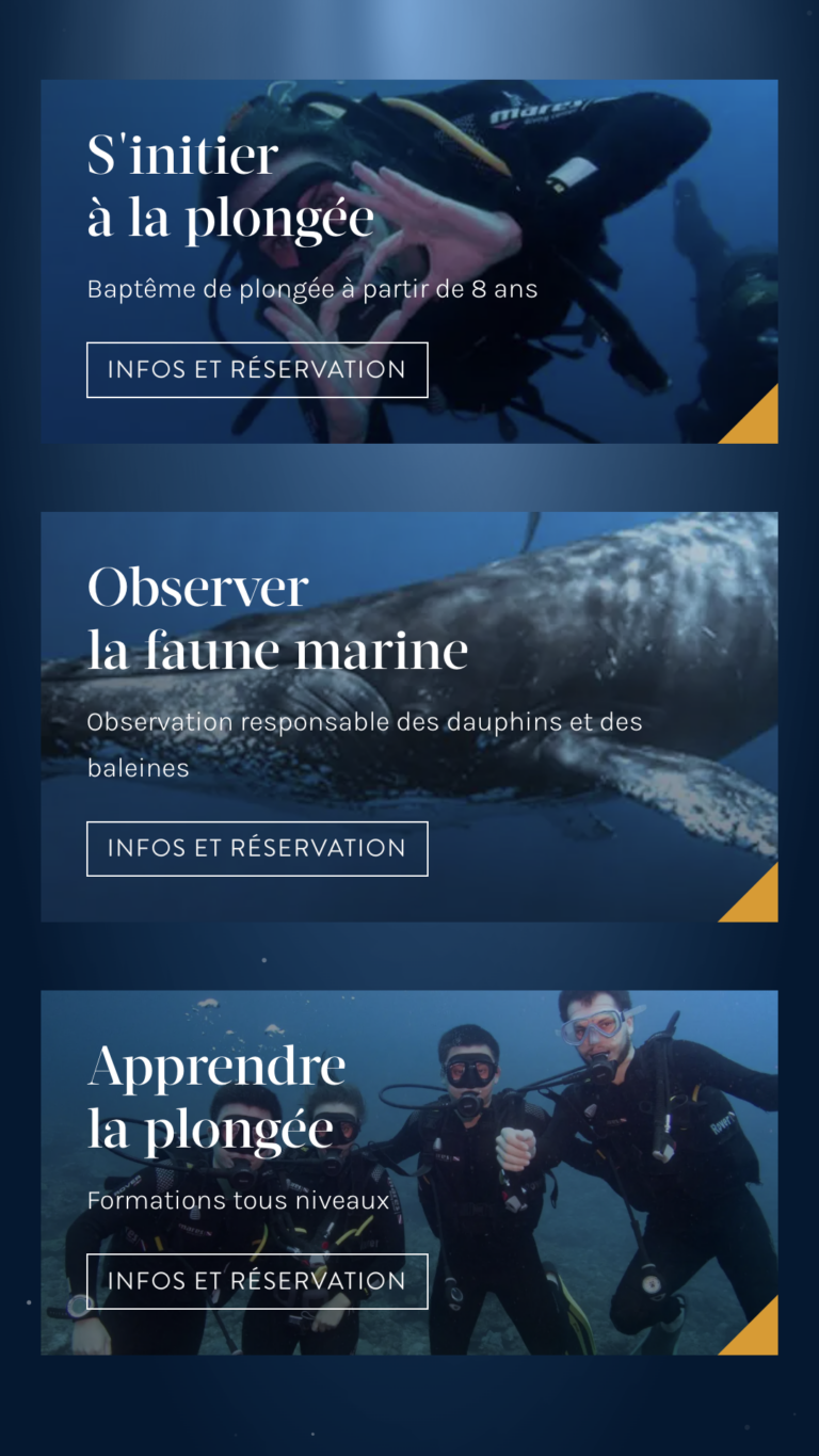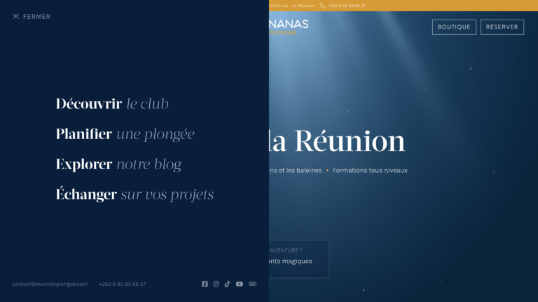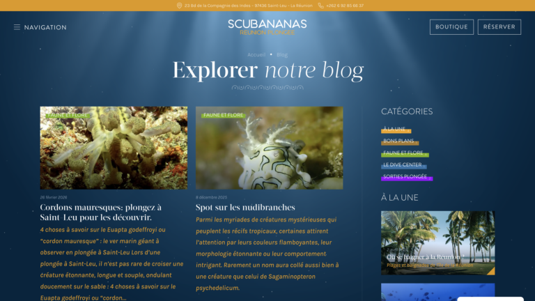 Xavier m’a confié la refonte complète du site. Audit UX, nouvelle direction artistique, maquettage, intégration WordPress avec Bricks Builder et montage vidéo — pour un club de plongée réunionnais qui méritait un site à la hauteur de ses eaux. Résultat : quelque chose qui donne envie de réserver avant même d’avoir tout lu.
